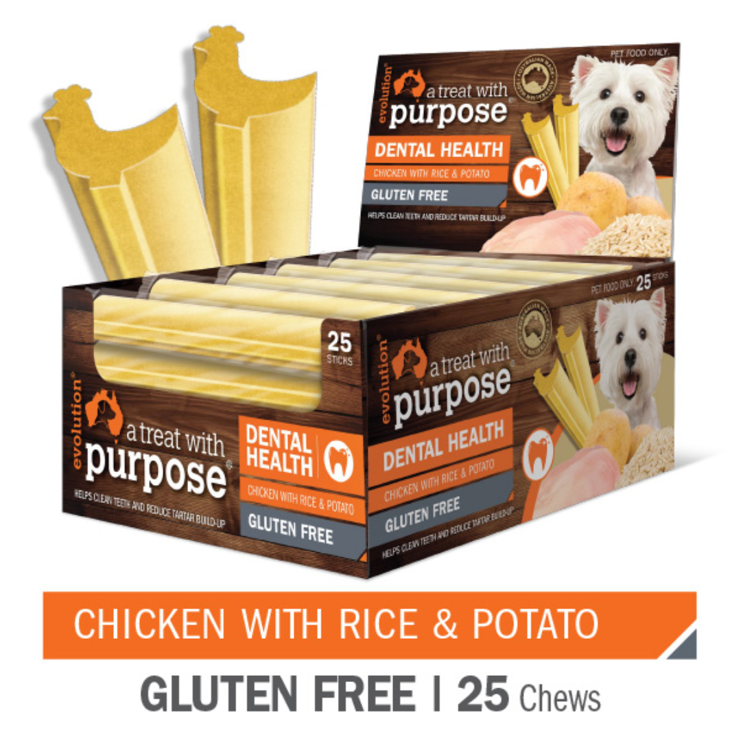 Evolution, “A Treat with Purpose” Dental Health Range, is the perfect addition to your dog’s Dental health routine. These healthy, irresistible dental sticks are gluten free and contain no artificial colours or flavours. 100 % Australian made and owned and enriched with Vitamins and Minerals including Zinc, Iron, Vitamin E, B2, B1, B6, and calcium, they help clean your dog’s teeth & gums to reduce plaque & reduce tartar build up.